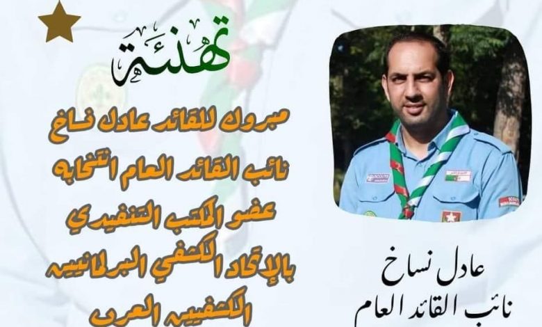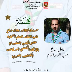 على إثر انتخاب نائب القائد العام للكشافة الإسلامية الجزائرية القائد عادل نساخ بالمكتب التنفيذي بالاتحاد الكشفي البرلمانيين الكشفيين العرب ، هذا اليوم ، بمناسبة انعقاد الجمعية العامة الرابعة عشر للاتحاد ، تتقدم القيادة العامة للكشافة الإسلامية الجزائرية وعلى رأسها السيد القائد العام بخالص التهاني والتبريكات ، متمنين له التوفيق والسداد في مهامه الجديدة .