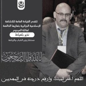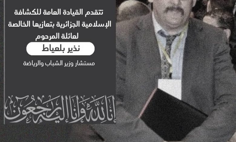 بعميق من الحزن والأسى بلغني اللحظة نبأ وفاة المغفور له بإذن الله تعالى الفقيد نذير بلعياط ، وعلى اثر هذا المصاب الجلل ، أتقدم باسمي الخاص وباسم أعضاء القيادة العامة للكشافة الاسلامية الجزائرية بخالص التعازي والمواساة لكم و لأسرة المرحوم ، راجين من الله العلي القدير أن يرحمه برحمته الواسعة وأن يلهم أهله وذويه جميل الصبر والسلوان ، عظم الله اجركم وجزاكم الله الجزاء الأوفى واحسن عزاءكم وغفر لميتكم واسكنه فسيح جناته